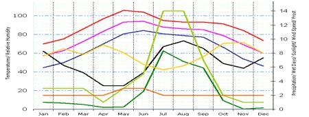 The weather is hot most of the year with variations from region to region. The coolest weather lasts from around December to February, with fresh mornings and evenings and mostly sunny days. The really hot weather, when it is dry, dusty and unpleasant, is between March and June. Monsoon rains occur in most regions in summer anywhere between June and early October.